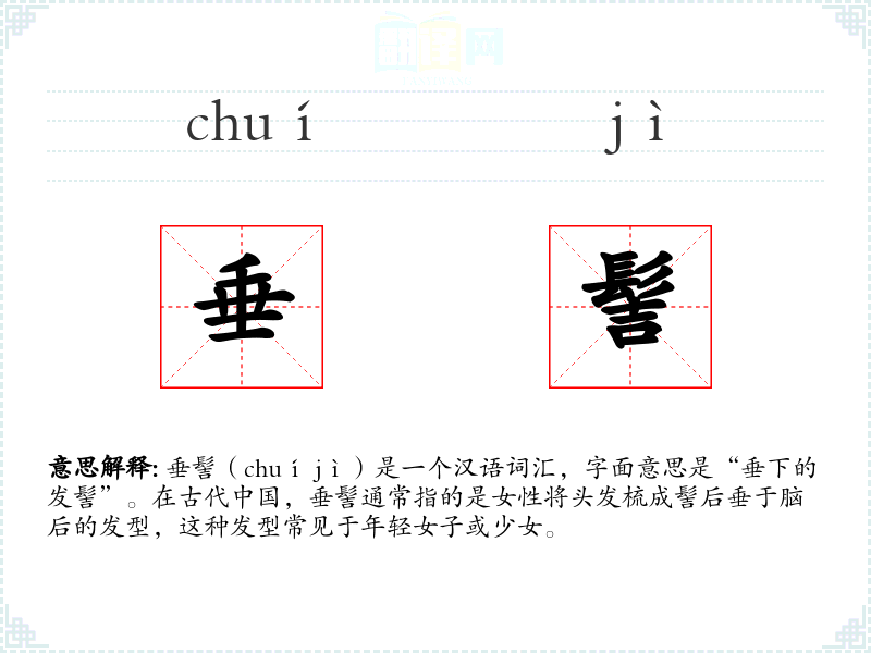 垂髻(chuí jì)是一个汉语词汇,字面意思是“垂下的发髻”。在古代**,垂髻通常指的是女性将头发梳成髻后垂于脑后的发型,这种发型常见于年轻女子或少女。