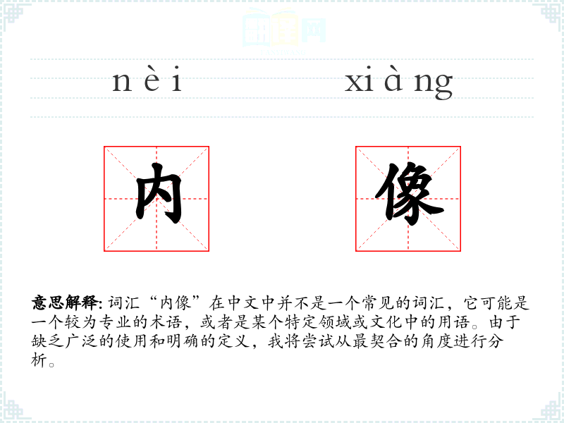 词汇“内像”在中文中并不是一个常见的词汇,它可能是一个较为专业的术语,或者是某个特定领域或文化中的用语。由于缺乏广泛的使用和明确的定义,我将尝试从最契合的角度进行分析。