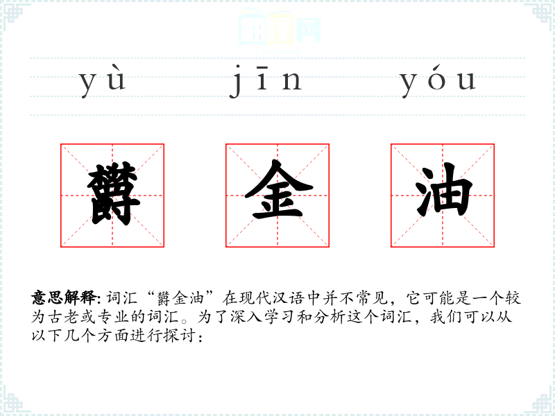 词汇“欝金油”在现代汉语中并不常见,它可能是一个较为古老或专业的词汇。为了深入学习和分析这个词汇,我们可以从以下几个方面进行探讨: