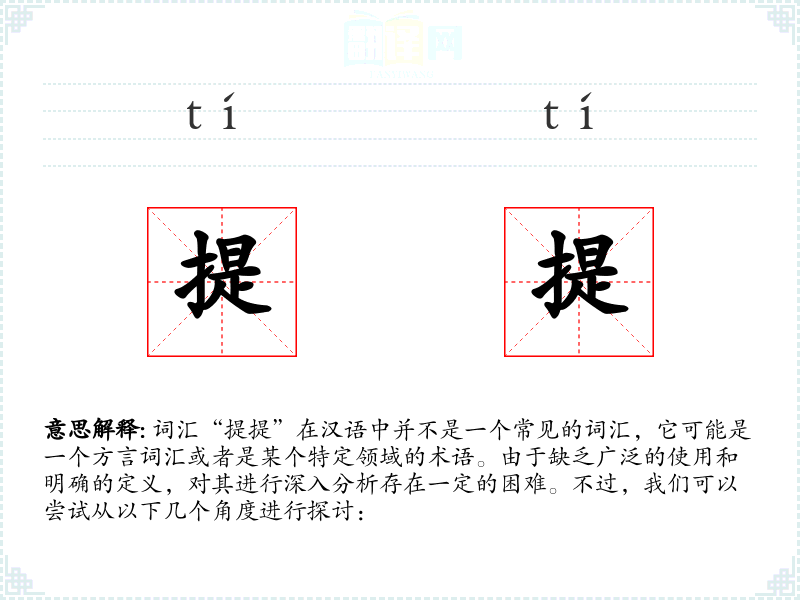 由于“提提”不是一个标准汉语词汇,我们无法给出一个确切的基本定义。它可能是某个地方方言中的词汇,或者是某个特定行业或社群中的术语。