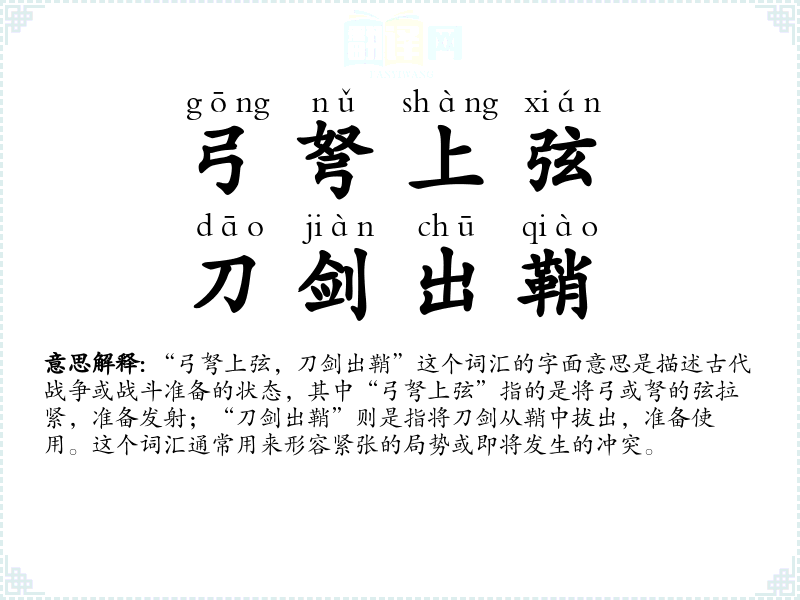 “弓弩上弦,刀剑出鞘”这个词汇的字面意思是描述古代战争或战斗准备的状态,其中“弓弩上弦”指的是将弓或弩的弦拉紧,准备发射;“刀剑出鞘”则是指将刀剑从鞘中拔出,准备使用。这个词汇通常用来形容紧张的局势或即将发生的冲突。