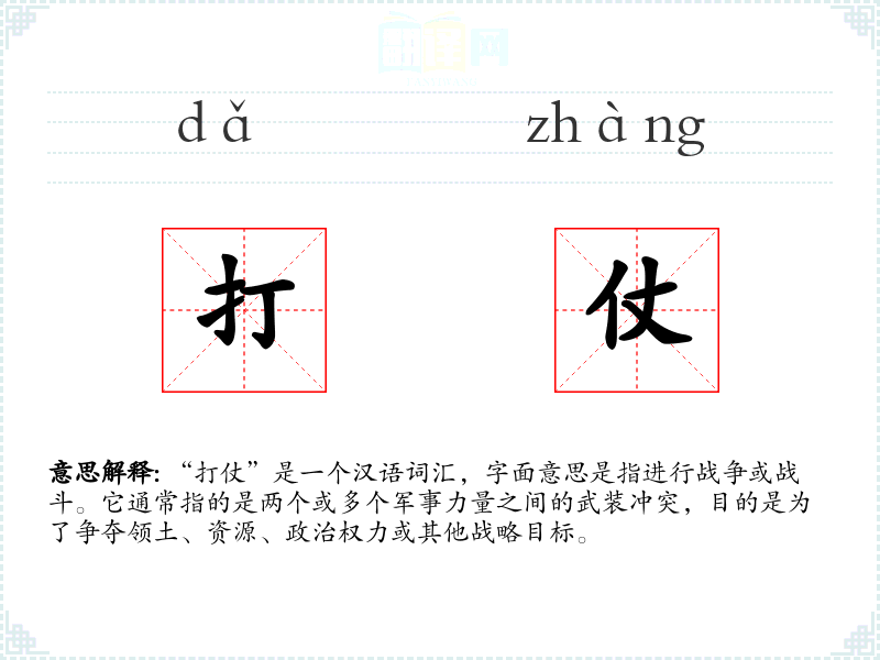 “打仗”是一个汉语词汇,字面意思是指进行战争或战斗。它通常指的是两个或多个军事力量之间的武装冲突,目的是为了争夺领土、资源、政治权力或其他战略目标。