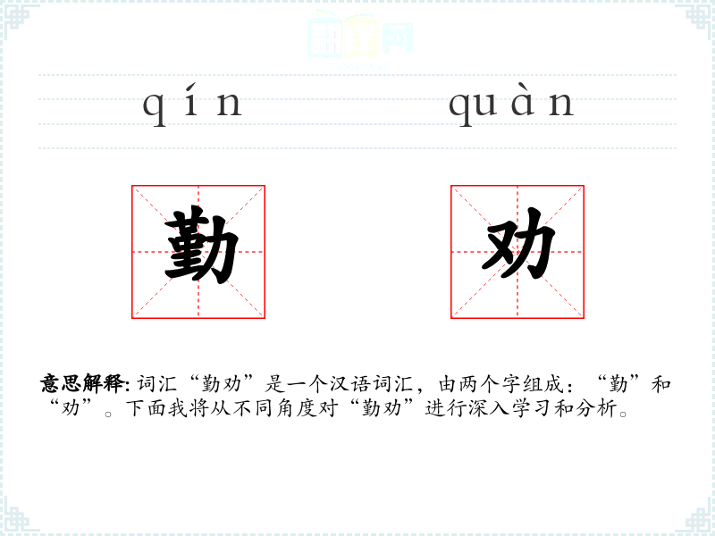 词汇“勤劝”是一个汉语词汇,由两个字组成:“勤”和“劝”。下面我将从不同角度对“勤劝”进行深入学*和分析。