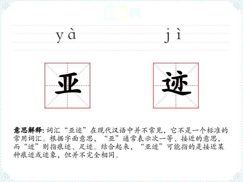 - 词源:“亚”源自古代汉语,表示次一等;“迹”源自古代汉语,表示痕迹。
