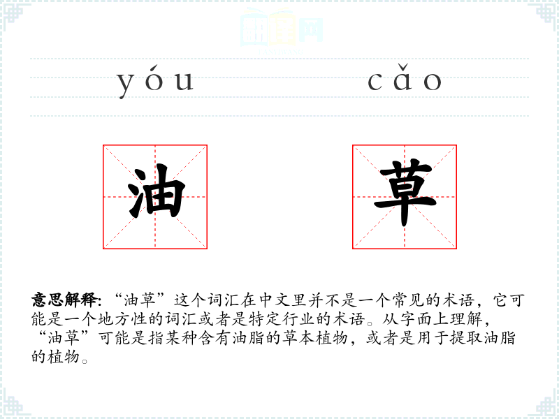 "油草"的意思解释、油草是什么意思由翻译网汉语词典查词提供。