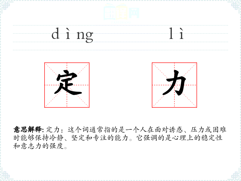 定力:这个词通常指的是一个人在面对诱惑、压力或困难时能够保持冷静、坚定和专注的能力。它强调的是心理上的稳定性和意志力的强度。