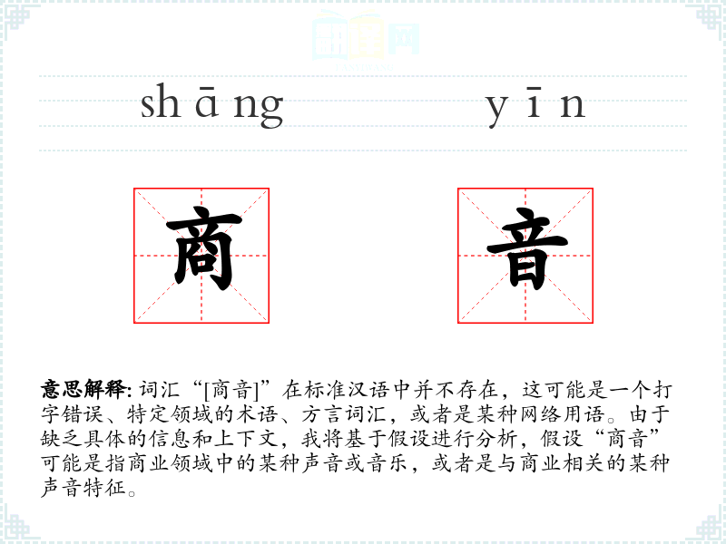 词汇“[商音]”在标准汉语中并不存在,这可能是一个打字错误、特定领域的术语、方言词汇,或者是某种网络用语。由于缺乏具体的信息和上下文,我将基于假设进行分析,假设“商音”可能是指商业领域中的某种声音或音乐,或者是与商业相关的某种声音特征。