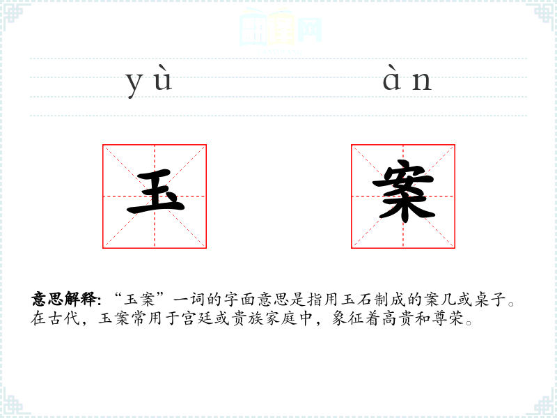 同义词:玉几、玉台、玉桌 反义词:木案、石案(这些词在材质上与“玉案”形成对比)