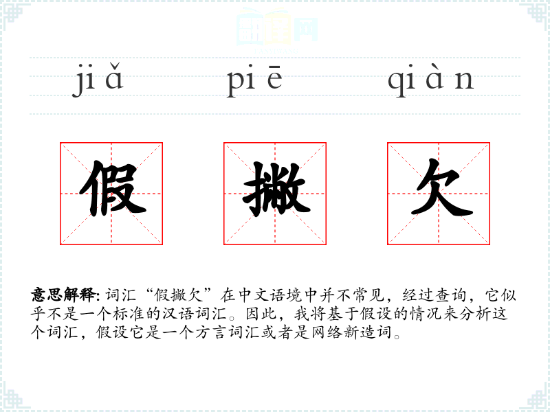 词汇“假撇欠”在中文语境中并不常见,经过查询,它似乎不是一个标准的汉语词汇。因此,我将基于假设的情况来分析这个词汇,假设它是一个方言词汇或者是网络新造词。