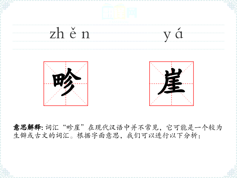 词汇“畛崖”在现代汉语中并不常见,它可能是一个较为生僻或古文的词汇。根据字面意思,我们可以进行以下分析: