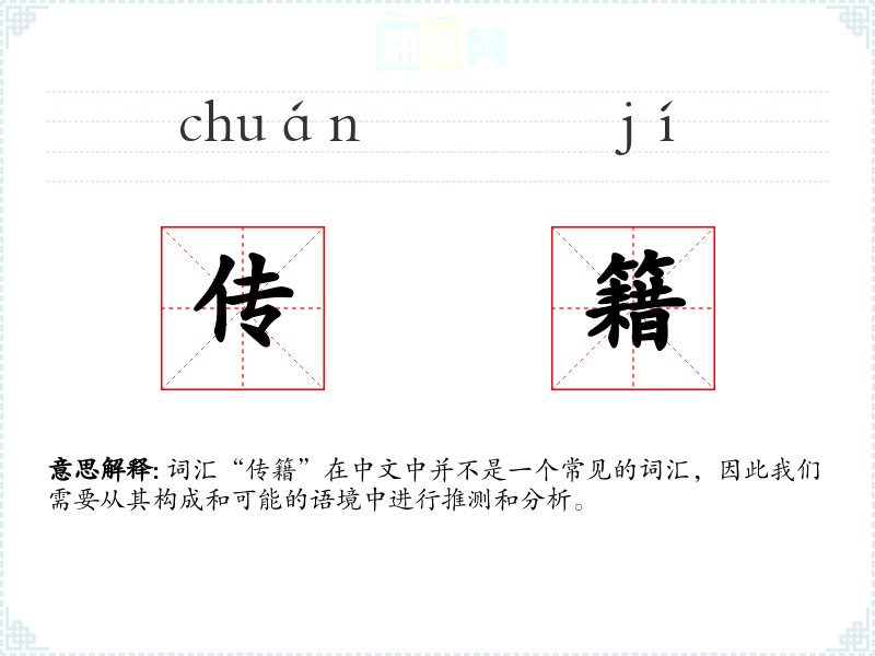 词汇“传籍”在中文中并不是一个常见的词汇,因此我们需要从其构成和可能的语境中进行推测和分析。