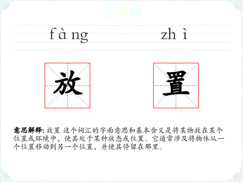 放置 这个词汇的字面意思和基本含义是将某物放在某个位置或环境中,使其处于某种状态或位置。它通常涉及将物体从一个位置移动到另一个位置,并使其停留在那里。
