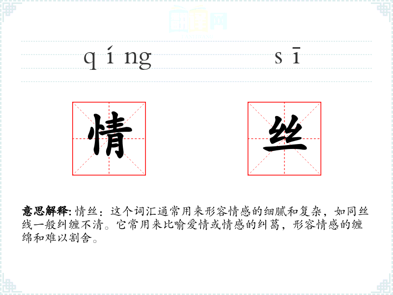 情丝:这个词汇通常用来形容情感的细腻和复杂,如同丝线一般纠缠不清。它常用来比喻爱情或情感的纠葛,形容情感的缠绵和难以割舍。