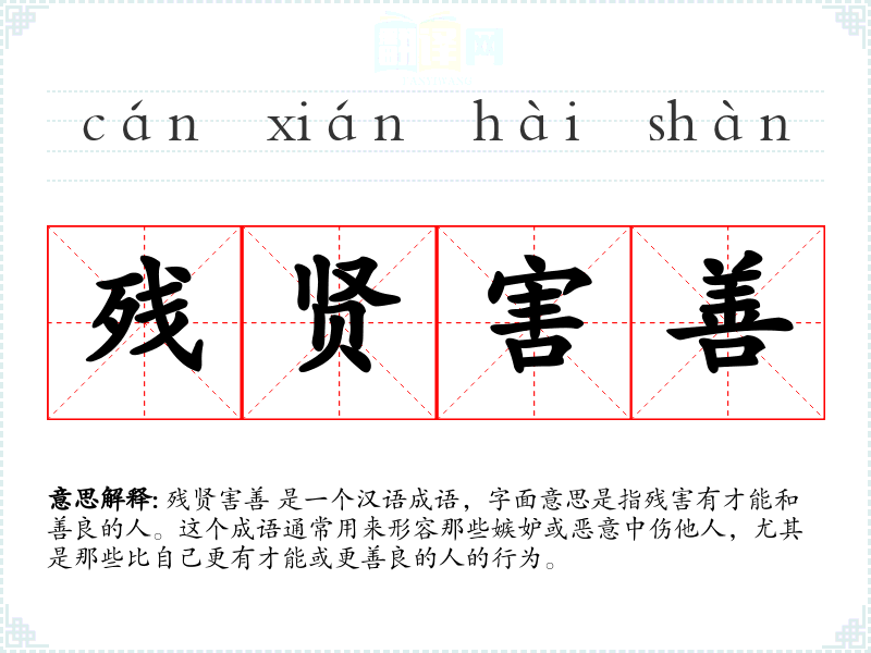 残贤害善 是一个汉语成语,字面意思是指残害有才能和善良的人。这个成语通常用来形容那些嫉妒或恶意中伤他人,尤其是那些比自己更有才能或更善良的人的行为。