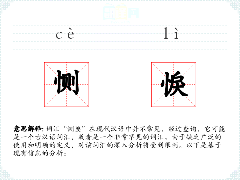 词汇“恻悷”在现代汉语中并不常见,经过查询,它可能是一个古汉语词汇,或者是一个非常罕见的词汇。由于缺乏广泛的使用和明确的定义,对该词汇的深入分析将受到限制。以下是基于现有信息的分析: