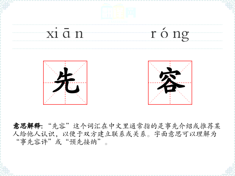 “先容”这个词汇在中文里通常指的是事先介绍或推荐某人给他人认识,以便于双方建立联系或关系。字面意思可以理解为“事先容许”或“预先接纳”。