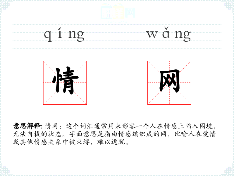 情网:这个词汇通常用来形容一个人在情感上陷入困境,无法自拔的状态。字面意思是指由情感编织成的网,比喻人在爱情或其他情感关系中被束缚,难以逃脱。