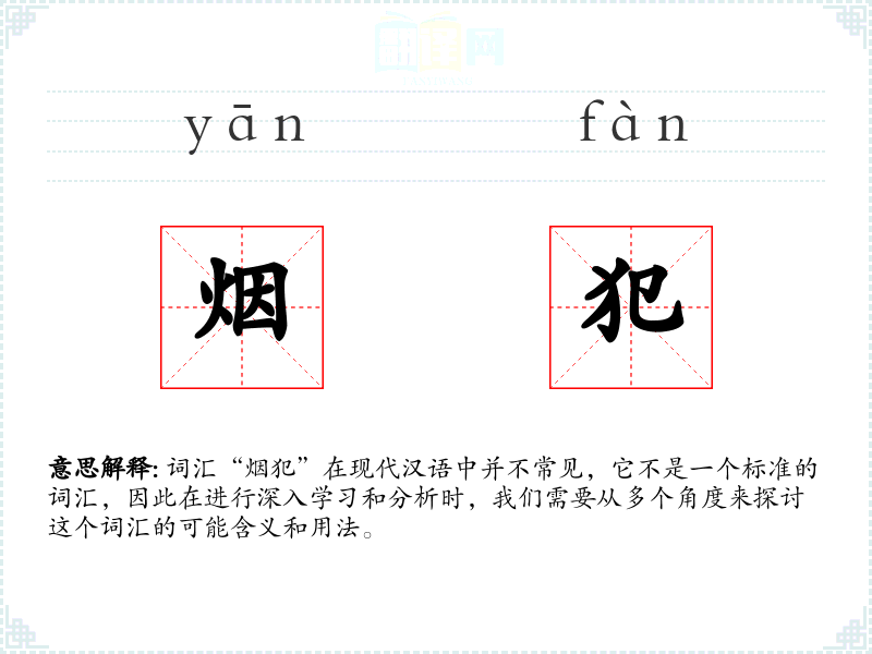 “烟犯”这个词汇的字面意思可以理解为“因烟而犯”,即因为烟雾而导致的某种违规或犯罪行为。然而,这个词汇在标准汉语中并不常见,可能是一个特定领域或方言中的词汇。