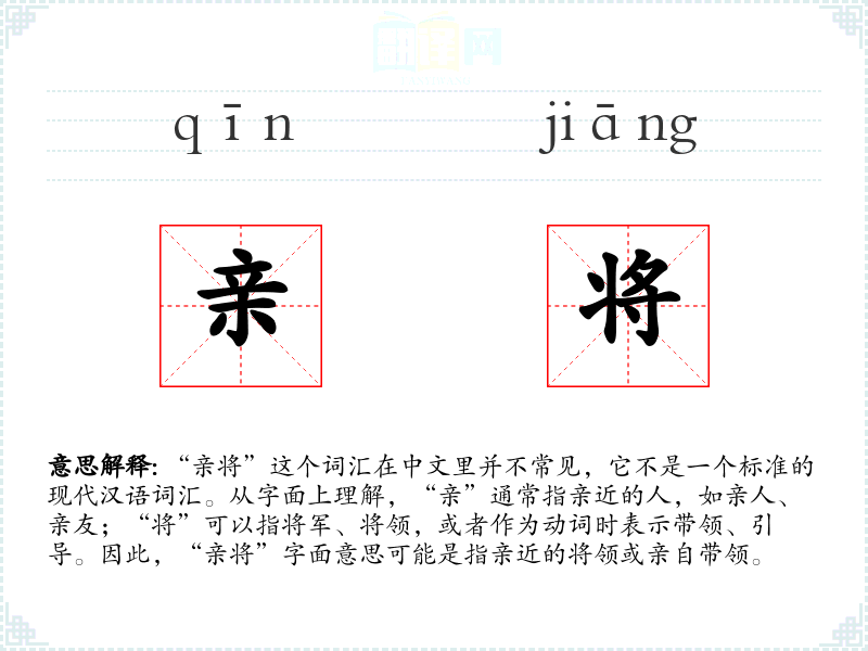 “亲将”这个词汇在中文里并不常见,它不是一个标准的现代汉语词汇。从字面上理解,“亲”通常指亲近的人,如亲人、亲友;“将”可以指将军、将领,或者作为动词时表示带领、引导。因此,“亲将”字面意思可能是指亲近的将领或亲自带领。