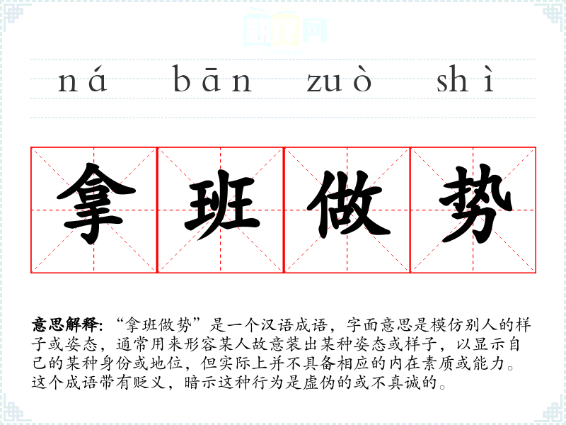 “拿班做势”是一个汉语成语,字面意思是模仿别人的样子或姿态,通常用来形容某人故意装出某种姿态或样子,以显示自己的某种身份或地位,但实际上并不具备相应的内在素质或能力。这个成语带有贬义,暗示这种行为是虚伪的或不真诚的。