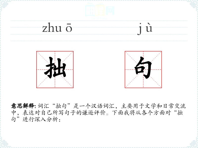 - 专业领域:在学术或专业写作中,作者可能会用“拙句”来谦虚地评价自己的论述或观点,尤其是在提出初步或不成熟的想法时。