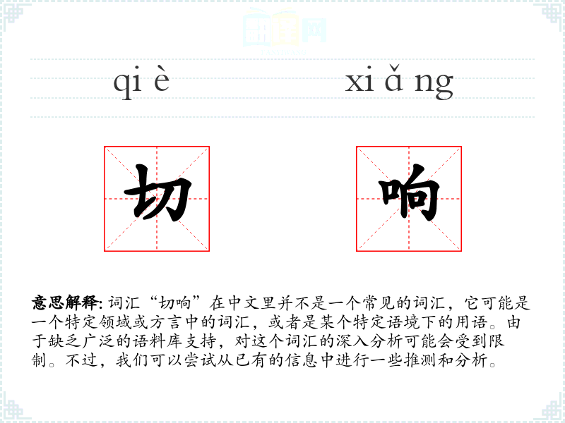 词汇“切响”在中文里并不是一个常见的词汇,它可能是一个特定领域或方言中的词汇,或者是某个特定语境下的用语。由于缺乏广泛的语料库支持,对这个词汇的深入分析可能会受到限制。不过,我们可以尝试从已有的信息中进行一些推测和分析。