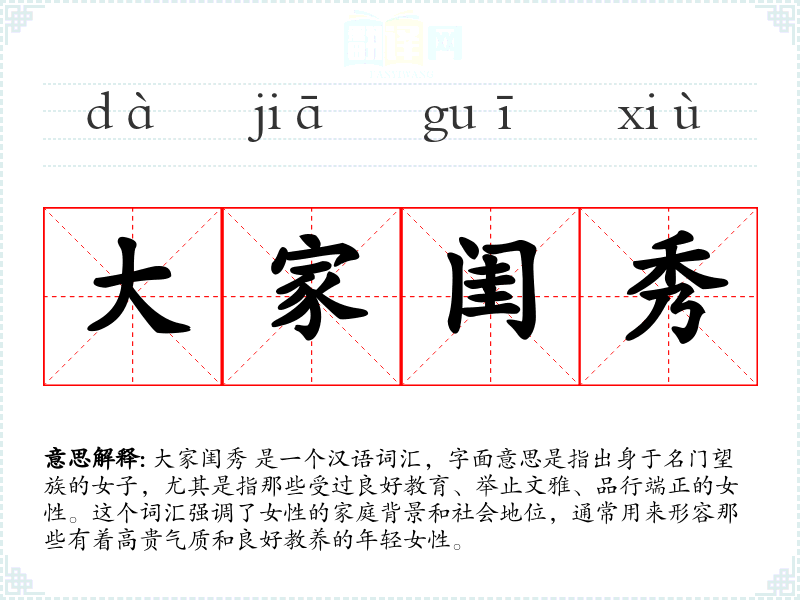大家闺秀 是一个汉语词汇,字面意思是指出身于名门望族的女子,尤其是指那些受过良好教育、举止文雅、品行端正的女性。这个词汇强调了女性的家庭背景和社会地位,通常用来形容那些有着高贵气质和良好教养的年轻女性。