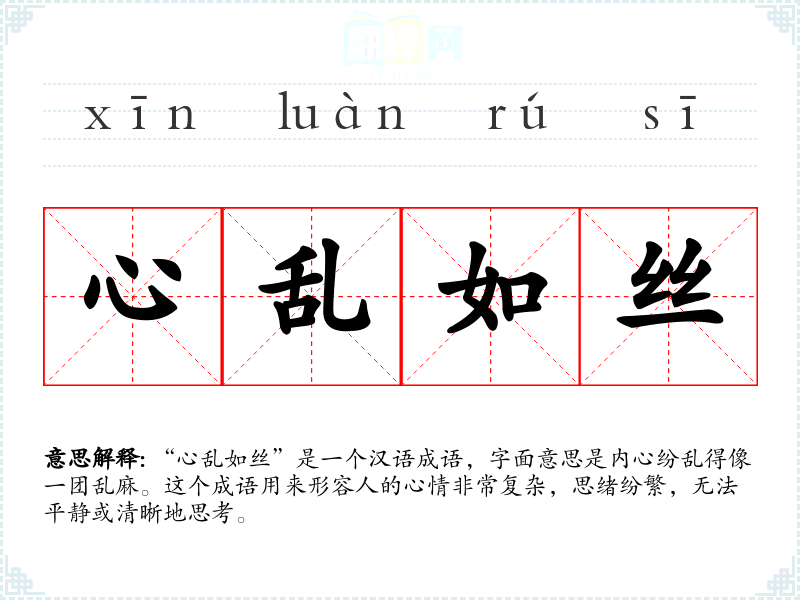 “心乱如丝”是一个汉语成语,字面意思是内心纷乱得像一团乱麻。这个成语用来形容人的心情非常复杂,思绪纷繁,无法平静或清晰地思考。
