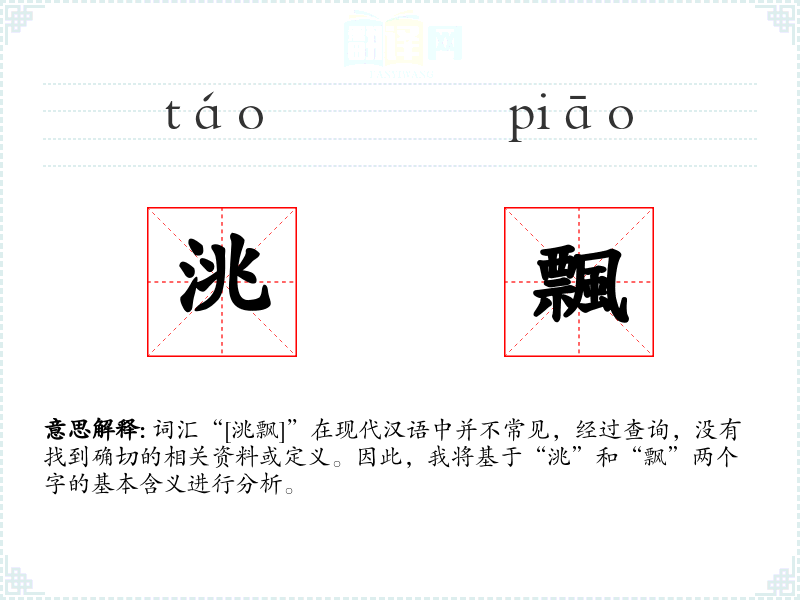 词汇“[洮飘]”在现代汉语中并不常见,经过查询,没有找到确切的相关资料或定义。因此,我将基于“洮”和“飘”两个字的基本含义进行分析。