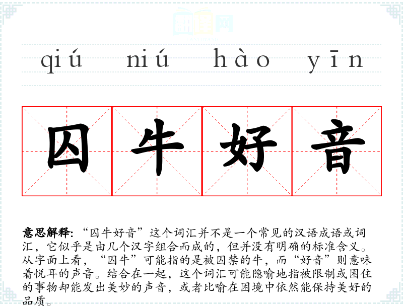 由于“囚牛好音”不是一个标准词汇,它在不同语境下的使用可能非常有限,甚至可能只在特定的文学作品或个人创作中出现。在文学中,它可能被用来象征性地表达即使在逆境中也能保持优雅或高尚的品质。