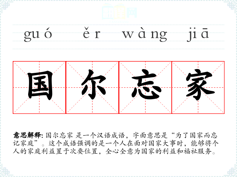 国尔忘家 是一个汉语成语,字面意思是“为了国家而忘记家庭”。这个成语强调的是一个人在面对国家大事时,能够将个人的家庭利益置于次要位置,全心全意为国家的利益和福祉服务。