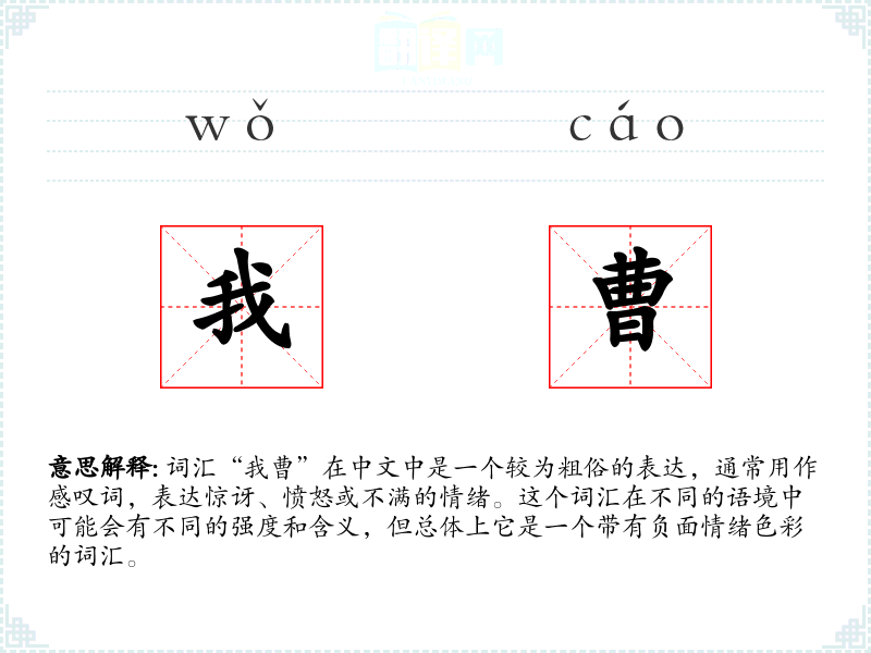 词汇“我曹”在中文中是一个较为粗俗的表达,通常用作感叹词,表达惊讶、愤怒或不满的情绪。这个词汇在不同的语境中可能会有不同的强度和含义,但总体上它是一个带有负面情绪色彩的词汇。