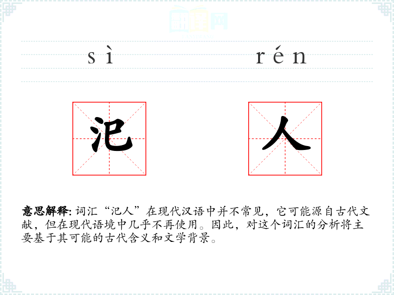 词汇“汜人”在现代汉语中并不常见,它可能源自古代文献,但在现代语境中几乎不再使用。因此,对这个词汇的分析将主要基于其可能的古代含义和文学背景。