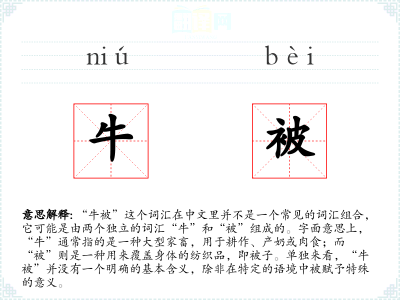 “牛被”这个词汇在中文里并不是一个常见的词汇组合,它可能是由两个独立的词汇“牛”和“被”组成的。字面意思上,“牛”通常指的是一种大型家畜,用于耕作、产奶或肉食;而“被”则是一种用来覆盖身体的纺织品,即被子。单独来看,“牛被”并没有一个明确的基本含义,除非在特定的语境中被赋予特殊的意义。