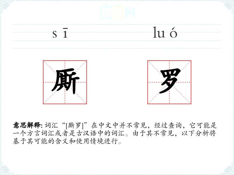 词汇“[厮罗]”在中文中并不常见,经过查询,它可能是一个方言词汇或者是古汉语中的词汇。由于其不常见,以下分析将基于其可能的含义和使用情境进行。