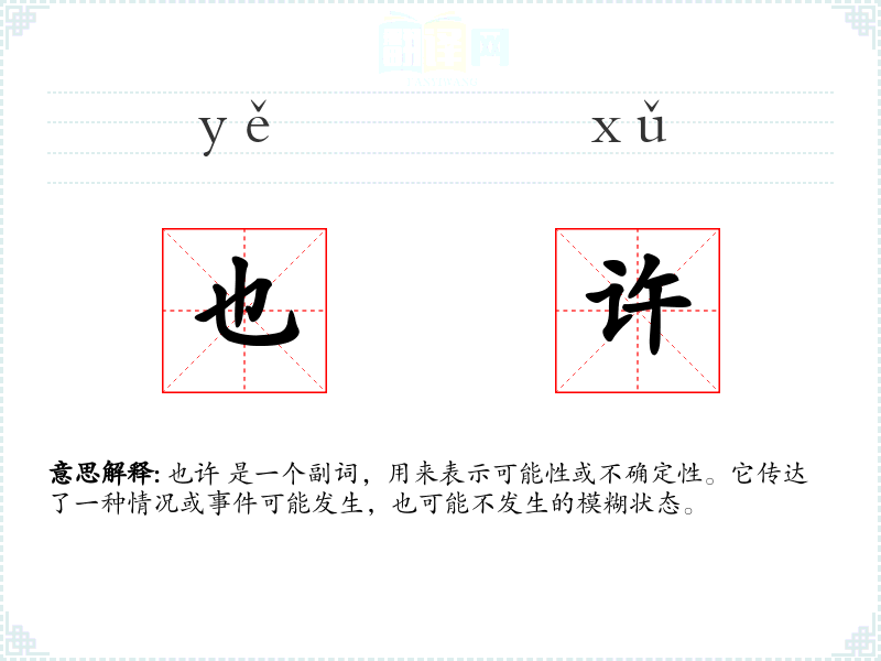 “也许”源自古代汉语,由“也”和“许”组成,表示“也可能”或“允许”。随着时间的推移,它逐渐演变成表示不确定性的现代用法。