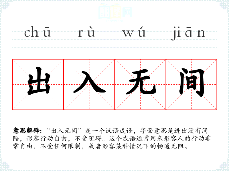 “出入无间”是一个汉语成语,字面意思是进出没有间隔,形容行动自由,不受阻碍。这个成语通常用来形容人的行动非常自由,不受任何限制,或者形容某种情况下的畅通无阻。