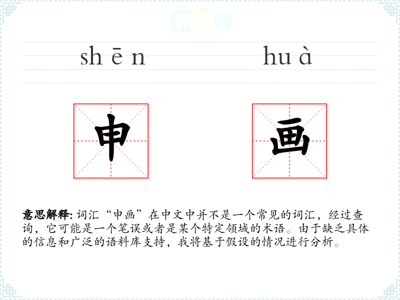 词汇“申画”在中文中并不是一个常见的词汇,经过查询,它可能是一个笔误或者是某个特定领域的术语。由于缺乏具体的信息和广泛的语料库支持,我将基于假设的情况进行分析。