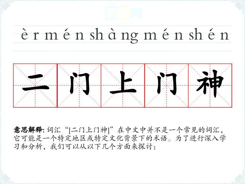 词汇“[二门上门神]”在中文中并不是一个常见的词汇,它可能是一个特定地区或特定文化背景下的术语。为了进行深入学*和分析,我们可以从以下几个方面来探讨: