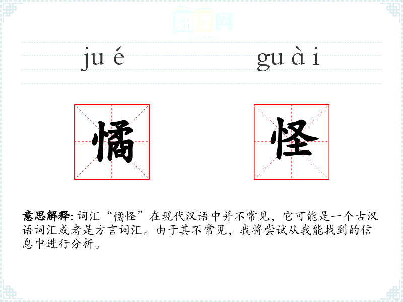 “憰怪”的字面意思可能与“奇怪”、“异样”或“不寻常”有关。然而,由于缺乏具体的现代用法,确切的定义可能需要依赖于古代文献或方言资料。