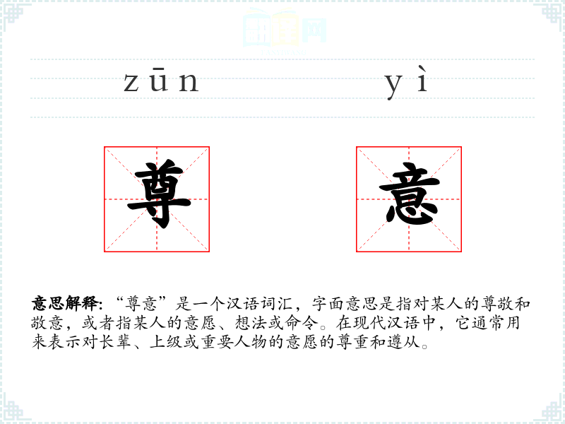 - 文学语境:在文学作品中,“尊意”常用于描述人物对权威或长辈的尊敬,如“他总是遵从父亲的尊意”。