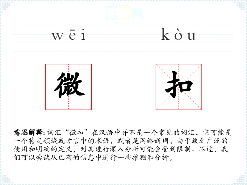 词汇“微扣”在汉语中并不是一个常见的词汇,它可能是一个特定领域或方言中的术语,或者是网络新词。由于缺乏广泛的使用和明确的定义,对其进行深入分析可能会受到限制。不过,我们可以尝试从已有的信息中进行一些推测和分析。
