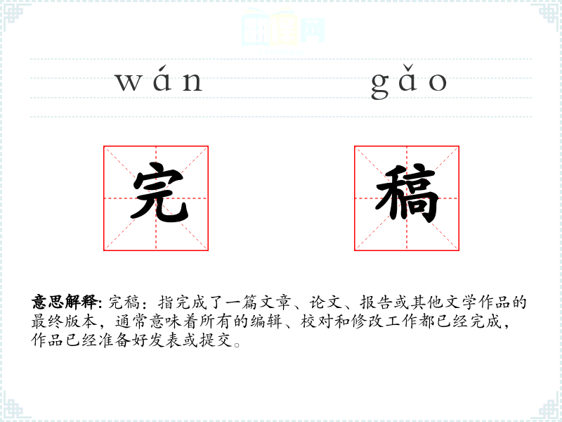 “完稿”一词由“完”和“稿”两个字组成。“完”意味着完整、完成,“稿”指的是文稿、稿件。这个词在中文里有着悠久的历史,但随着时间的推移,其使用频率和语境有所变化,特别是在现代出版和学术写作中更为常见。