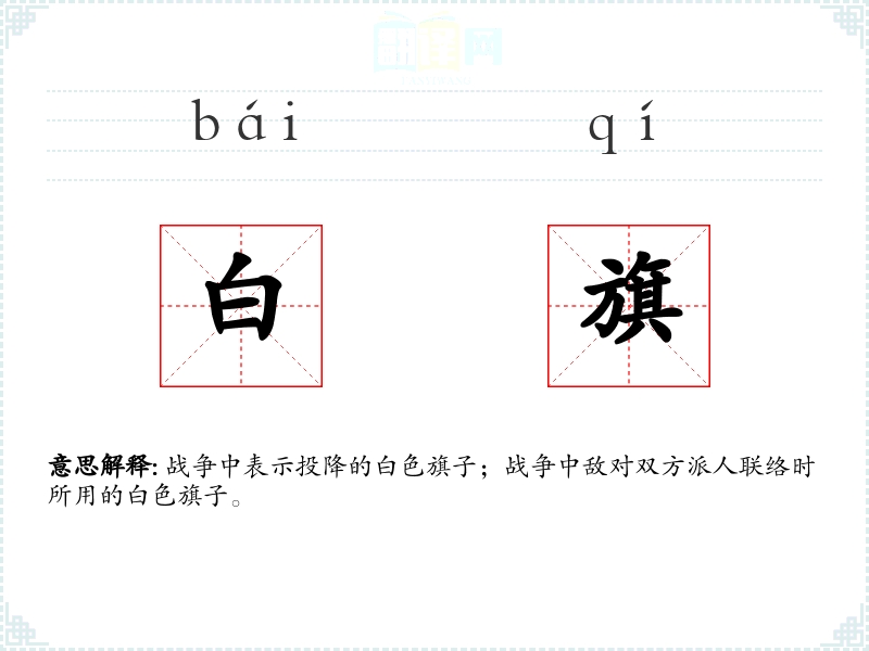 战争中表示投降的白色旗子;战争中敌对双方派人联络时所用的白色旗子。