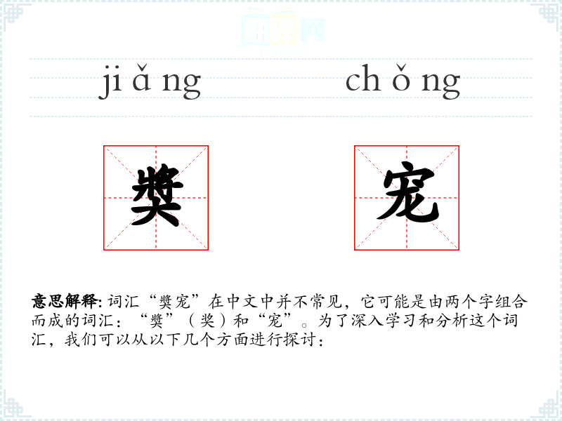“奬”字源自古代的奖励制度,而“宠”字则与宠爱、优待有关。这两个字组合在一起,形成了表示特别奖励和宠爱的词汇。