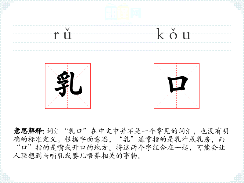 由于“乳口”不是一个标准词汇,我们无法给出一个确切的基本定义。它可能是一个方言词汇、特定行业的术语,或者是一个非常罕见的组合词。