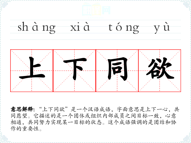 “上下同欲”是一个汉语成语,字面意思是上下一心,共同愿望。它描述的是一个团体或组织内部成员之间目标一致,心意相通,共同努力实现某一目标的状态。这个成语强调的是团结和协作的重要性。