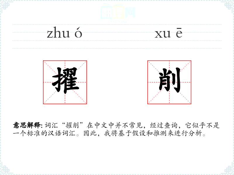 词汇“擢削”在中文中并不常见,经过查询,它似乎不是一个标准的汉语词汇。因此,我将基于假设和推测来进行分析。
