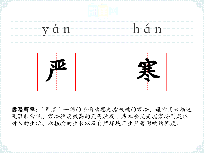 “严寒”一词由“严”和“寒”两个字组成。“严”字有严格、严肃之意,“寒”字则指寒冷。两者结合,强调了寒冷的程度之深。在古代文献中,如《诗经》等,已有使用“寒”字来描述天气的记录,而“严寒”作为一个复合词,可能在更晚的时期形成并广泛使用。