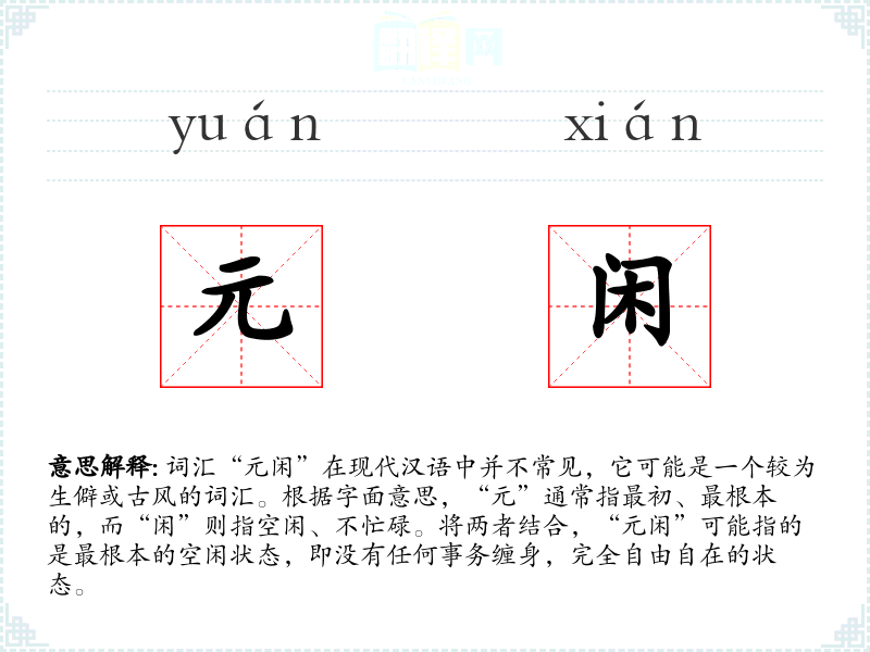 词汇“元闲”在现代汉语中并不常见,它可能是一个较为生僻或古风的词汇。根据字面意思,“元”通常指最初、最根本的,而“闲”则指空闲、不忙碌。将两者结合,“元闲”可能指的是最根本的空闲状态,即没有任何事务缠身,完全自由自在的状态。